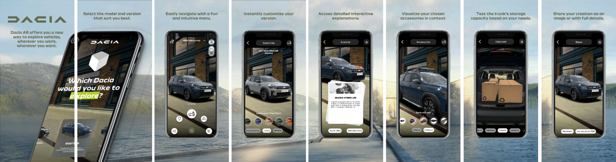 Intuicyjna, przystępna i nowoczesna aplikacja umożliwia wizualizację samochodów w dowolnym miejscu i w naturalnych rozmiarach, a także zajrzenie do ich wnętrza. W kilku krokach użytkownik może obejrzeć wszystkie dostępne modele Dacii, skonfigurować samochód zgodnie z własnymi preferencjami i zaledwie dwoma kliknięciami przejść do strony internetowej producenta, aby sprawdzić cenę i kontynuować zakup online.