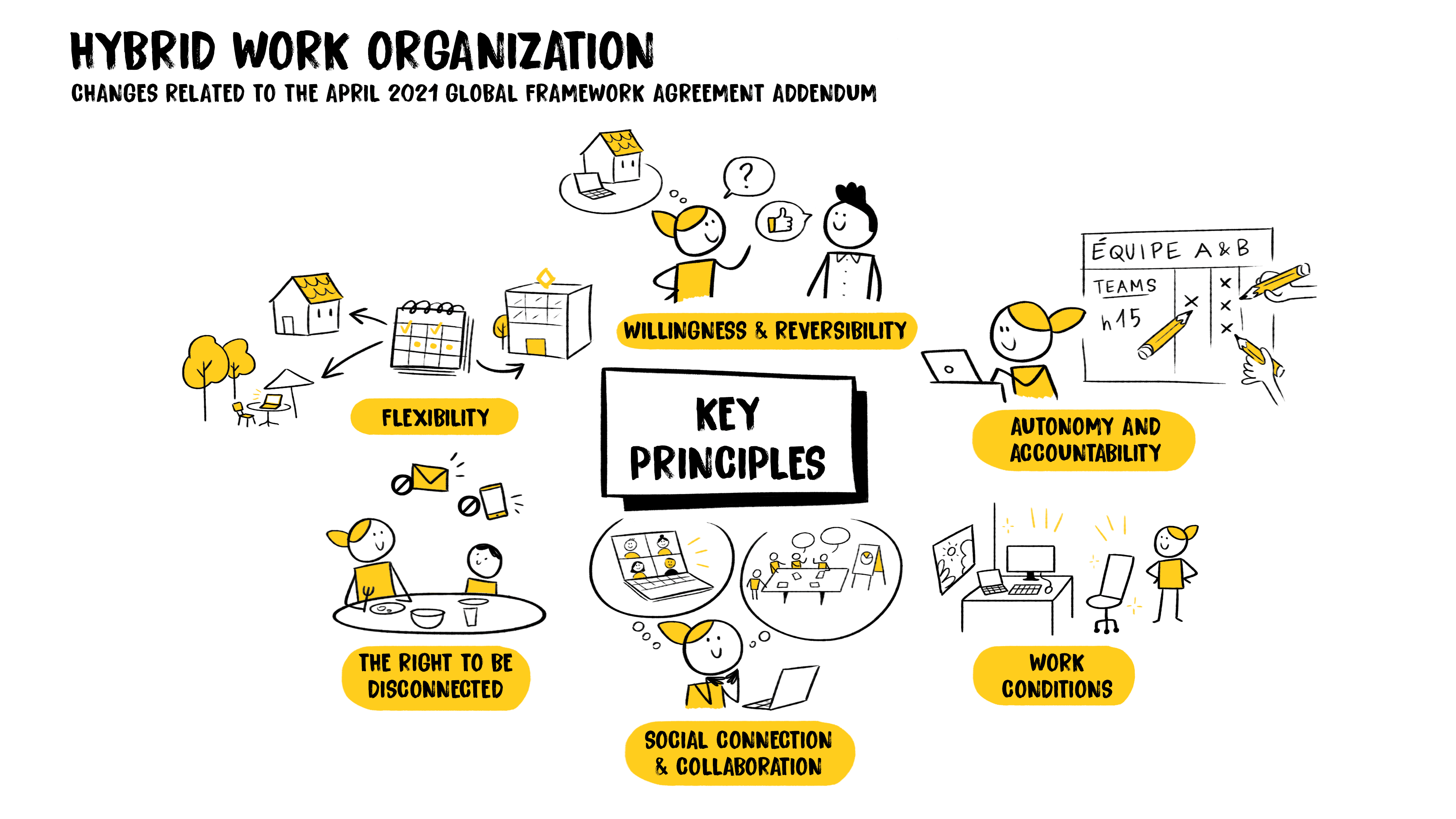 Nowa, hybrydowa organizacja pracy w Renault Group ma na celu jak najlepsze wykorzystanie zarówno pracy na miejscu, jak i pracy zdalnej i działa na zasadzie dobrowolności. Opiera się na następujących zasadach: