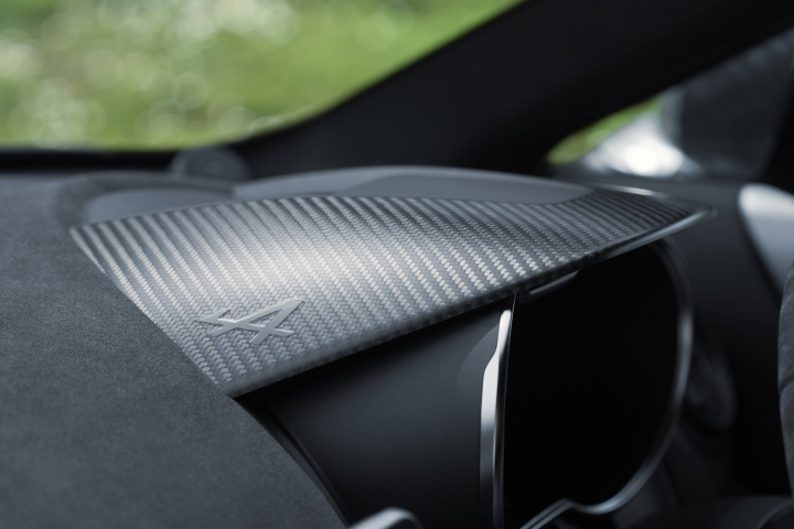 The A110 S Enstone Edition cockpit in black microfibre with grey stitching incorporates carbon elements from the same workshops as those used for the Alpine single-seaters. It extends and reinforces this exclusive experience, with, for the first time in an A110, an interior made up of authentic carbon components from the design tools, moulds and autoclaves of the Alpine F1 factory in Enstone: the visor decorated with the famous A arrow, the central console bearing the BWT Alpine F1® Team signature and its drop zone.